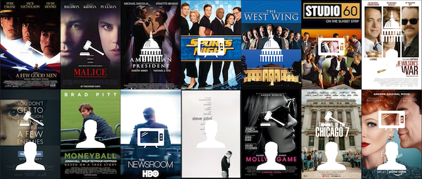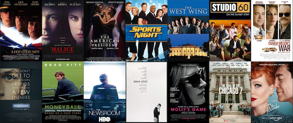 To date, Mr. Sorkin has written for four TV shows and received writing credit on ten movies. Of those four TV shows, three of them… are about TV shows, as is one of his movies. The remaining TV show takes place inside the US government, as do two of his movies. Five of the remaining movies have at least one scene that takes place inside a deposition or a court room — and seven of his movies are biopics retelling the stories of historical figures or events.