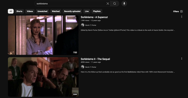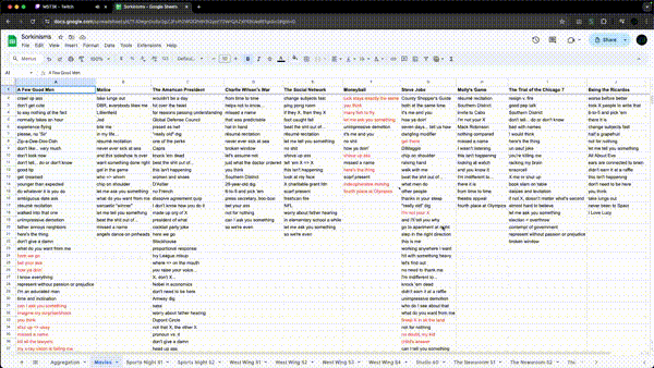 As such, I decided to go through all his on-screen works and compile a document on all the Sorkinisms I could catch from having watched everything multiple times. The act of doing so revealed north of 400 different elements that I thought could reasonably be considered Sorkinisms.